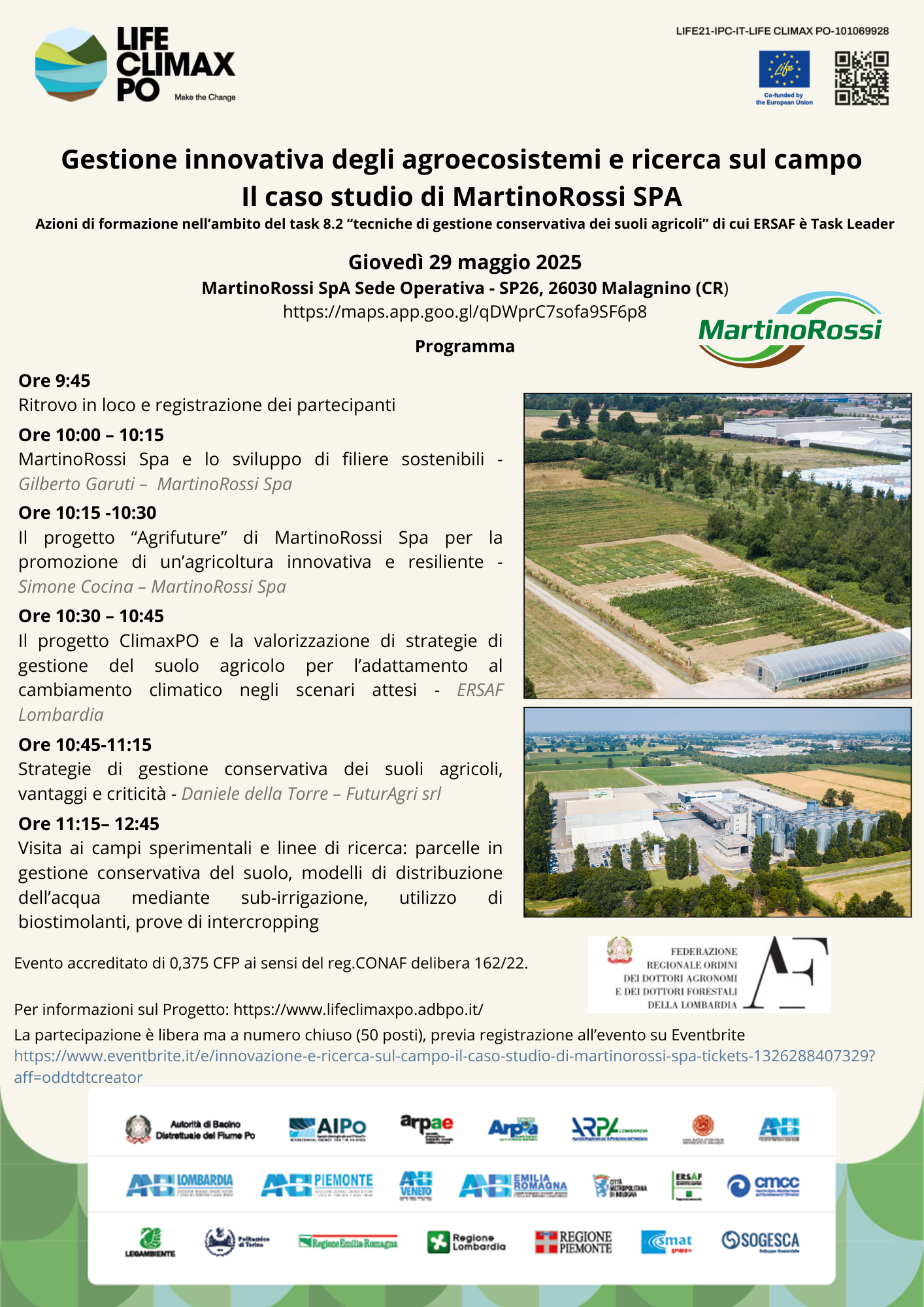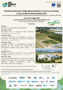 Il programma della giornata prevede, oltre a momenti di confronto e presentazione delle attività di ERSAF e MartinoRossi nell’ambito del progetto LIFE CLIMAXPO, una visita guidata ai campi sperimentali dell’azienda. Sarà un’occasione preziosa per osservare direttamente l’implementazione di pratiche innovative e discutere con esperti e colleghi le potenzialità e le criticità associate all’agricoltura conservativa e ad altre strategie di gestione sostenibile.