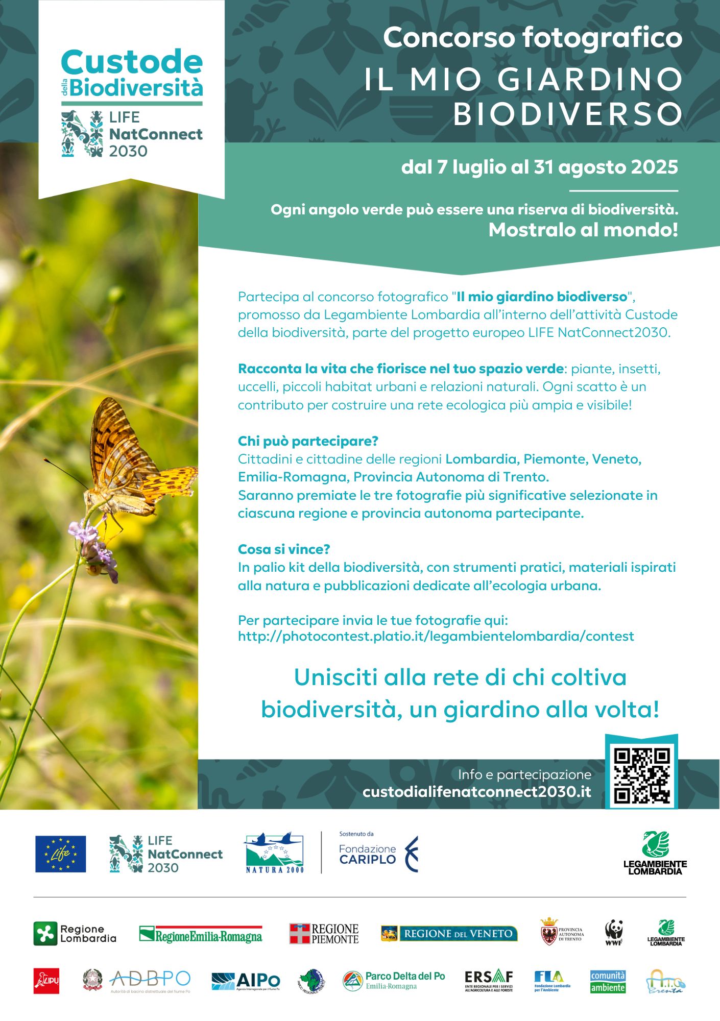 Anche un piccolo balcone può diventare un rifugio per la biodiversità. Dal 7 luglio al 31 agosto 2025 è attivo il concorso fotografico “Il mio giardino biodiverso”, promosso nell’ambito dell’attività Custode della biodiversità del progetto europeo LIFE NatConnect2030, con l’obiettivo di valorizzare la biodiversità urbana e domestica e promuovere il coinvolgimento diretto delle comunità locali nella sua tutela.